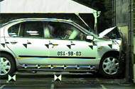 вверх на 64 мм. Было зафиксировано значительное вминание ниши для ног и смещение педали тормоза назад на 250 мм. Защита головы и шеи водителя была продемонстрирована на хорошем уровне, а подушка безопасности зафиксировала его голову. Ремни безопасности эффективно сработали и предотвратили удар груди о рулевое колесо. Левым коленом водитель ударился об обшивку рулевой колонки, ручку ее регулятора, а затем о нижний край передней панели. Если бы горизонтальный угол удара по панели был немного другой, то сила удара была бы больше, и колено могло бы удариться о замок зажигания, что привело бы к травме. А если бы колено пробило обшивку передней панели, то травма могла бы оказаться значительно тяжелее. Рычаг управления мог бы тоже послужить причиной локализованной травмы колена. Правым коленом водитель оцарапался об обшивку рулевой колонки, а затем ударился о переднюю панель. Если бы направление удара немного сместилось в горизонтальной плоскости, то удар коленом пришелся бы по механизму регулировки колонки, а, может быть, и по замку зажигания, который расположен выше. А если предположить, что колено прошло еще дальше, то опасность получения травмы резко бы возросла. Край консоли регулятора колонки тоже мог бы серьезно повредить колено. Значительная деформация ниши для ног стала причиной, по которой защита ступней и лодыжек была признана плохой. Пассажир в целом оказался хорошо защищенным – его голова, шея, оба колена, тазобедренная часть, также обе голени не пострадали при лобовом ударе. Единственно слабым местом оказалась грудная клетка, на которую пришлись травмоопасные нагрузки от ремня безопасности. Результаты, полученные с датчиков манекена-пассажира, не изменялись для моделирования ситуаций с различной степенью деформации автомобиля. БОКОВОЙ УДАР :: В результате бокового удара грудь, живот и таз водителя получили удар от двери автомобиля, что в реальной жизни может стать причиной травмы, поэтому оценка за защиту груди была поставлена "слабая", а защита живота и таза была признана адекватной. Тем не менее, голова оказалась хорошо защищенной. СТОЛКНОВЕНИЕ С ПЕШЕХОДОМ ::