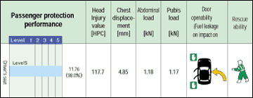 ЛОБОВОЙ УДАР :: Пассажирский салон сохранил свою структурную целостность при ударе. Защита шеи была признана «слабой», так как шея сильно согнулась назад. Жёсткие