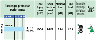 Велика вероятность получения водителем и пассажиром травм коленей из-за сильно смещающихся в салон торпедо и рулевой колонки. Усиленная ниша для ног деформировалась, но лишь незначительно. БОКОВОЙ УДАР :: Система безопасности при боковом ударе включает в себя вмонтированные в спинки передних кресел подушки безопасности и подушки для защиты головы. Показания датчика, закрепленного на груди манекена-водителя, несколько занижены, так как часть нагрузки принял на себя позвоночник. Это снизило оценку при данном тесте на один балл. БЕЗОПАСНОСТЬ ПАССАЖИРОВ-ДЕТЕЙ :: Текст на 4 языках, предупреждающий об опасности размещения детей на переднем кресле спиной по ходу движения при включенной подушке безопасности, нанесен только на одну сторону солнцезащитного козырька. Система безопасности пассажиров-детей включает в себя рекомендованные компанией Suzuki кресла Britax Romer Duo Plus, закрепленные на потолке страховочной лямкой при помощи креплений ISOFIX. При лобовом ударе зарегистрированы высокие нагрузки в области головы манекена полуторагодовалого ребенка. Датчик, закрепленный на груди манекена 3-летнего ребенка, также зафиксировал превышение допустимых перегрузок. Но в целом, система безопасности детей в автомобиле находится на хорошем уровне. СТОЛКНОВЕНИЕ С ПЕШЕХОДОМ :: Капот автомобиля обладает достаточным эффектом амортизации в зонах соприкосновения головы ребенка-пешехода в случае столкновения. Но в аналогичной ситуации взрослый пешеход рискует получить более серьезные травмы. Бампер и передний край капота автомобиля вполне отвечают предъявляемым требованиям. СИСТЕМЫ БЕЗОПАСНОСТИ :: Suzuki Swift оборудован двумя фронтальными одноуровневыми подушками безопасности, боковыми подушками безопасности, подушкой для защиты головы (занавеска), ремнями безопасности с преднатяжителями и ограничителями нагрузки. Также эта модель оснащена креплениями ISOFIX, закрепленными на потолке страховочными лямками для задних боковых мест, антиблокировочной системой, электронной системой распределения тормозных сил и системой brake assist в качестве стандартной комплектации. |