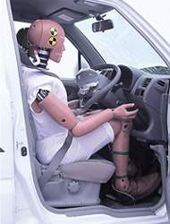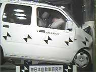 The body front was slightly crushed, and the collision energy was mostly absorbed within the engine room. Inside the compartment, the foot floor was quite severely deformed for both the driver's seat and front passenger's seat, and the retreat amount of the brake pedal was also quite severe. The top and bottom portions of the steering wheel were deformed. At collision, the dummies were firmly restrained, and their position after the collision was not changed. The front passenger's door was opened with both hands. | ||||||||||||||||||||||||||||