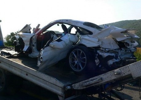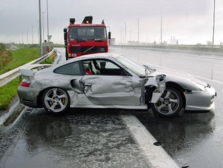 Porsche 911 GT2 2003 года, Бельгия. Разбит через три дня после приобретения. Водитель не успел затормозить на мокрой дороге и врезался в грузовик.