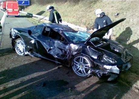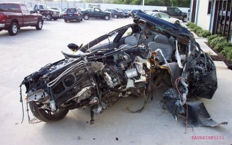 Ferrari F430 2008 года. Разбит через восемь дней после покупки. Водитель попытался в последний момент свернуть к нужному выезду с шоссе, но не справился с управлением и перевернулся