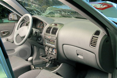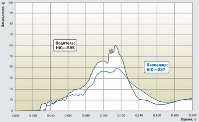 блокиратор рулевого вала, коврики и защиту картера. Судя по кузову - живее всех живых! На крыше - лишь небольшая складка. Слегка выгнута стойка лобового стекла. Водительская дверь отлично выдержала удар, и дверной проем остался практически нетронутым - такое же малое смещение передней стойки (20 мм) было у испытанного нами Форда Фокуса первого поколения. Мало того - дверь открылась! Правда, сперва пришлось распахнуть заднюю дверь, а потом приложить к ручке немалое усилие. Но ни Symbol, ни Logan на это были не способны - их водительские двери заклинило намертво. В салоне - практически никаких повреждений. Руль? На месте: смещение измеряется считанными миллиметрами. Следы удара на передней панели хранит разве что выдвижной ящик, в который уперлось левое колено водителя. Но жестких деталей в нижней части панели нет, и сделана она весьма травмобезопасно - никакой пенализации! Пол под ногами водителя целехонек. Разве что педали сцепления и тормоза сместились назад на 180 мм, прижав правую голень манекена. Но, судя по данным датчиков, этот «зажим» оказался совершенно безвредным. А о чем еще нам поведают манекены Hybrid III? Ведь сколько раз так бывало - деформация кузова вроде бы невелика, а нагрузки на голову и грудь «красные». За примером далеко ходить не надо - вазовская Калина, увы, именно такова. Замедление головы, усилия в «шейных позвонках» манекенов - в безопасной зоне. Критерий травмирования головы (HIC) манекена-водителя - всего 595. Между прочим, у Логана с подушкой было 890 - уж не говоря про Калину с ее запредельным коэффициентом в 1384. Наконец, нагрузка от ремней на «грудные клетки» манекенов тоже ниже, чем в Калине, Логане и Символе. О лидерстве речи не идет. Дело в том, что по правилам EuroNCAP за отсутствие подушки полагается пенализация в два балла - именно поэтому голова водителя на цветной схеме не зеленая, а оранжевая. А смещенные на 180 мм педали тоже означают снижение оценки защиты ступней, и снижение серьезное - на этом Accent теряет сразу 3,2 балла. Итого - 9,9 балла из 16 возможных. Но все равно это отличный результат! Во-первых, Акцент грамотно сконструирован. Мотор установлен на мощнейшем подрамнике, который крепится к кузову восемью болтами и плавно «перетекает» в лонжероны. Поэтому смещенный удар воспринимается не только водительской стороной автомобиля, но и пассажирской. Обратите внимание на то, что весь передок Акцента свернут на сторону. А, например, у Калины пассажирская сторона осталась практически нетронутой - тут при ударе работала только левая «половинка» кузова, которая не смогла поглотить столько же кинетической энергии, как передок Акцента. Во-вторых, судя по разбитому нами Акценту, с технологией на ТагАЗе полный порядок. Кузовные панели в Таганрог приходят из Кореи, но сварка - местная. И сварка качественная - мы не нашли ни одного разошедшегося шва! А в-третьих, эффективно удержать манекены помогли современные ремни с преднатяжителями, которые ставят на все таганрогские Акценты с прошлого года. На экспериментальной Калине с подушками, краш-тест которой мы наблюдали на АвтоВАЗе, преднатяг тоже был. Но на Калине он оказался неэффективным. А на Акценте - и перемещение манекенов под контролем, и нагрузки на «грудные клетки» невелики. Опять-таки, для сравнения: на Renault Logan преднатяжители не ставят... Словом, Hyundai Accent - это хорошо спроектированны