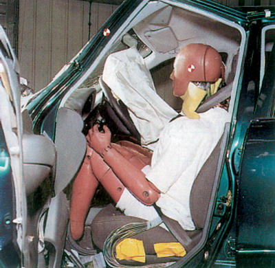значительно пострадала – передняя стойка выгнулась внутрь, и лопнули сварные швы в нише для ног. Подушка безопасности обеспечила защиту головы манекена водителя, но, раскрываясь, ударила его в