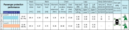 Figures in the chart of each vehicle model shows the score (HIC is converted to a score) in each area.