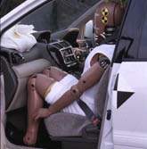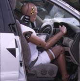 passenger's seat side was comparatively big. A fused belt waist buckling seat belt system was employed for both seats; therefore, the forward movement of the dummy's waist upon impact was significant. The steering column fell off upon impact. |