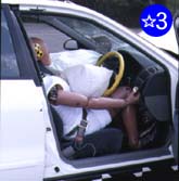 compartment, as well as slight deformation in the center area of the right-side of the roof. Both seats came with a fuse-belt type waist seat belts, and the dummy's waist greatly moved forward upon collision. The final posture of the dummy after collision showed that the waist shifted toward the center area of the front seat.