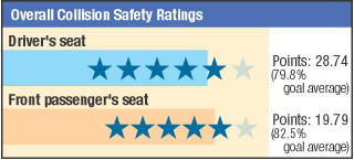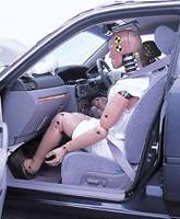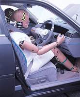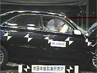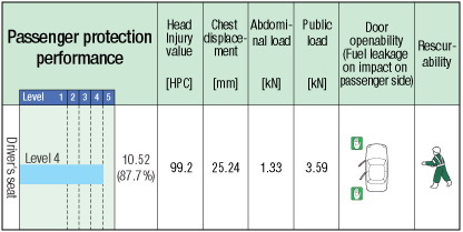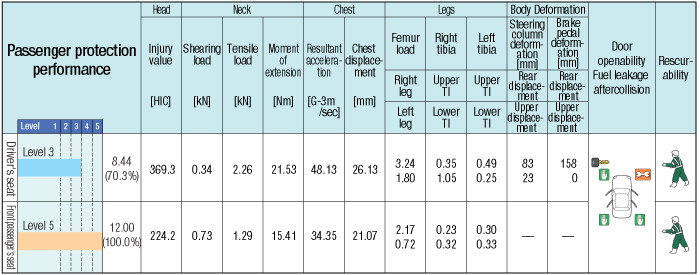 The body front was crushed quite severely, but the collision energy was mostly absorbed within the engine room. Inside the compartment, the deformation of the foot floor was severe for the driver's seat, and quite severe for the foot floor of the passenger's seat. At collision, the dummies were firmly restrained, and their position after the collision was not changed. | ||||||||||||||||||||||||||||
