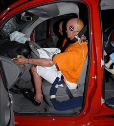 ЛОБОВОЙ УДАР :: Система, безопасности водителя и пассажира состоит из одноступенчатых подушек безопасности и привязных ремней, оборудованных преднатяжителями и ограничителями нагрузки. В целом, был обеспечен приемлемый уровень безопасности, однако была зафиксирована повышенная нагрузка на грудные клетки. Поскольку кузов Kangoo потерял целостность, водитель может получить травму груди. Кроме того, водитель и в меньшей степени пассажир также рискуют получить травму колен при ударе о жесткие элементы, расположенные под передней панелью. Каждое сидение заднего ряда оборудовано трехточечным ремнем, который положительно влияет на уровень безопасности. Боковой удар :: Система защиты при боковом ударе была признана эффективной даже при отсутствии боковых надувных подушек. Датчики манекена зафиксировали удар животом и тазом о выскочившую металлическую отделку двери, который может привести к их травме. БЕЗОПАСНОСТЬ ПАССАЖИРОВ-ДЕТЕЙ :: Для испытаний были предложены детские кресла, разработанные компанией Renault. При этом, для полуторагодовалого ребенка использовалось кресло Kiddy Easyfix с фиксацией спиной по направлению движения, а для трехлетнего ребенка – кресло Britax Romer Duo с фиксацией лицом вперед. Оба кресла предотвратили удар головой о внутренние элементы салона автомобиля, однако старший ребенок испытал повышенную нагрузку на грудную клетку. На креслах предусмотрены нестирающиеся наклейки с инструкцией по эксплуатации, однако они были признаны не совсем четкими, особенно в части касающейся использования креплений ISOFIX. На обеих сторонах противосолнечного козырька пассажира закреплены таблички, предупреждающие об опасности устанавливать детское кресло с фиксацией спиной вперед на переднем пассажирском сидении. Однако в них не говорится о возможных серьезных последствиях в случае игнорирования данного предупреждения. СТОЛКНОВЕНИЕ С ПЕШЕХОДОМ :: Во время испытаний только два небольших участка на верхней части капота могут снизить вероятность травматизма пешехода при столкновении. А бампер и передний край капота не оставляют никакого шанса избежать травмы, что считается очень плохим показателем. ОСНАЩЕНИЕ АВТОМОБИЛЯ :: Модель Kangoo выпуска 2003 года оборудована двумя фронтальными подушками безопасности, передними ремнями с преднатяжителями и ограничителями нагрузки, задними ремнями с ограничителями нагрузки, креплениями детских кресел ISOFIX и верхним анкерным креплением на центральном заднем сидении, а также индикатором ремня безопасности водителя. |