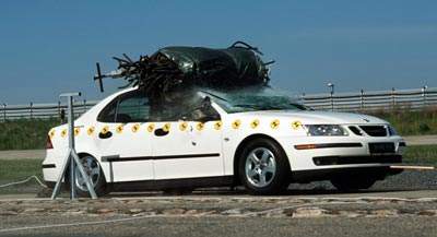 Конструкторы приложили много усилий, чтобы обеспечить безопасность водителя и пассажиров. После того, как производитель усовершенствовал педальный узел, эксперты EuroNCAP провели повторный фронтальный краш-тест. Итогом стала высшая оценка в пять звезд. Салон хорошо выдержал удар, хотя на грудь манекенов водителя и переднего пассажира пришлась значительная нагрузка. Передние подушки безопасности являются двухуровневыми и оснащены датчиками положения сидения. В испытании на боковой удар, в том числе и при «столбовом» тесте, автомобиль вел себя безупречно. Модель аналогична седану Saab 9-3, так что тест на безопасность пешеходов отдельно не проводился. |