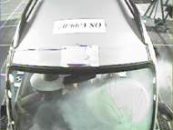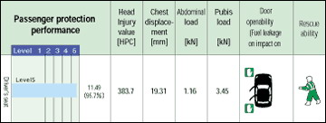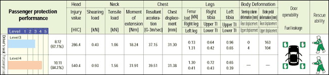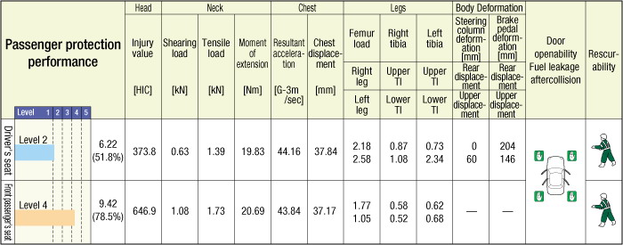 The body front was slightly crushed, and the collision energy was mostly absorbed within the engine room. Inside the compartment, the deformation of the foot floor was slight for both the driver's seat and passenger's seat. At collision, the dummies were firmly restrained, and their position after the collision was not changed. | ||||||||||||||||||||||||||||