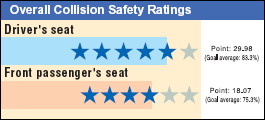 Велика вероятность получения водителем и пассажиром травм коленей из-за сильно смещающихся в салон торпедо и рулевой колонки. Усиленная ниша для ног деформировалась, но лишь незначительно. БОКОВОЙ УДАР :: Система безопасности при боковом ударе включает в себя вмонтированные в спинки передних кресел подушки безопасности и подушки для защиты головы. Показания датчика, закрепленного на груди манекена-водителя, несколько занижены, так как часть нагрузки принял на себя позвоночник. Это снизило оценку при данном тесте на один балл. БЕЗОПАСНОСТЬ ПАССАЖИРОВ-ДЕТЕЙ :: Текст на 4 языках, предупреждающий об опасности размещения детей на переднем кресле спиной по ходу движения при включенной подушке безопасности, нанесен только на одну сторону солнцезащитного козырька. Система безопасности пассажиров-детей включает в себя рекомендованные компанией Suzuki кресла Britax Romer Duo Plus, закрепленные на потолке страховочной лямкой при помощи креплений ISOFIX. При лобовом ударе зарегистрированы высокие нагрузки в области головы манекена полуторагодовалого ребенка. Датчик, закрепленный на груди манекена 3-летнего ребенка, также зафиксировал превышение допустимых перегрузок. Но в целом, система безопасности детей в автомобиле находится на хорошем уровне. СТОЛКНОВЕНИЕ С ПЕШЕХОДОМ :: Капот автомобиля обладает достаточным эффектом амортизации в зонах соприкосновения головы ребенка-пешехода в случае столкновения. Но в аналогичной ситуации взрослый пешеход рискует получить более серьезные травмы. Бампер и передний край капота автомобиля вполне отвечают предъявляемым требованиям. СИСТЕМЫ БЕЗОПАСНОСТИ :: Suzuki Swift оборудован двумя фронтальными одноуровневыми подушками безопасности, боковыми подушками безопасности, подушкой для защиты головы (занавеска), ремнями безопасности с преднатяжителями и ограничителями нагрузки. Также эта модель оснащена креплениями ISOFIX, закрепленными на потолке страховочными лямками для задних боковых мест, антиблокировочной системой, электронной системой распределения тормозных сил и системой brake assist в качестве стандартной комплектации. |