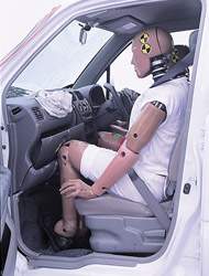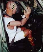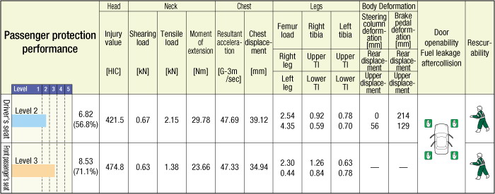 The body front was slightly crushed, and the collision energy was mostly absorbed within the engine room. Inside the compartment, the foot floor was quite severely deformed for both the driver's seat and front passenger's seat, and the retreat amount of the brake pedal was also quite severe. The top and bottom portions of the steering wheel were deformed. At collision, the dummies were firmly restrained, and their position after the collision was not changed. The front passenger's door was opened with both hands. | ||||||||||||||||||||||||||||