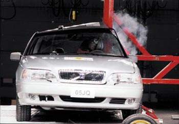 Результаты испытаний автомобиля Volvo S70 оказались для уверенных в собственной репутации шведов обескураживающими. Начало было весьма мажорным - вольвовская система защиты от боковых ударов SIPS (Side Impact Protection System) сработала великолепно, что видно по целиком "озелененному" профилю манекена. Но вот при фронтальном ударе картина была куда менее радужной. Деформация дверного проема оказалась как минимум вдвое выше, чем у остальных конкурентов. Пол при ударе был разрушен - складки и трещины образовались и в районе ног водителя (одна из них, с острыми краями, оказалась прямо за смещенной в салон на 16 см педалью тормоза), и даже справа, у ног переднего пассажира. Подушки безопасности сработали хорошо, но голова водителя, как видно на снимке, сползла влево. А кульминацией послужило открытие, совершенное при внимательном осмотре машины после удара. Исследуя причину травмоопасных нагрузок на колени водителя, эксперты обнаружили, что у автомобиля отсутствует предусмотренный конструкцией защитный элемент под рулевой колонкой! Вольвовцы объяснили это производственным браком и предоставили для повторного краш-теста комплектный автомобиль. Однако и в этом случае защита от травм коленей и ног водителя оказалась самой слабой среди автомобилей, принимавших участие в этих испытаниях. |