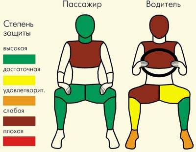 Защита груди - 0,7 балла (оценка для манекена пассажира). Нагрузка на правое бедро водителя дает 1,3 балла, но один балл долой - за травмоопасные зоны под передней панелью. Остается 0,3
