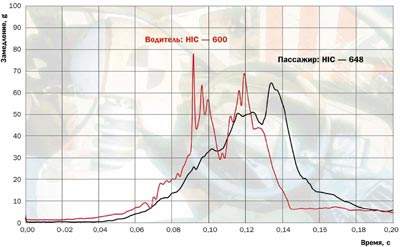 крышу. Потом кузов, точно сжатая пружина, отскочил от препятствия, и остаточная деформация оказалась равной 58 см. По характеру деформации кузова "десятка" больше всего походила на Peugeot 406 и Daewoo Nexia, чем на своих отечественных собратьев. Манекен-пассажир сидел ровнехонько - в процессе удара он лишь несильно уперся коленями в безопасно скошенную крышку перчаточного ящика, а удара головой не было вовсе. Но вот водитель... Этому бедняге досталось здорово. Увы, для него было немного толку от того, что жизненное пространство в салоне сократилось на допустимые 20%. Манекен сполз вниз и влево и сидел в неестественной, напряженной позе с задранными коленями. Ноги оказались зажатыми между нижней частью передней панели и полом. А правое колено врезалось точь-в-точь в рулевую колонку, пробило жесткий пластик кожуха и с близкой к предельно допустимой силой в 820 кг ударилось о металл. При этом даже оказалась рассечена пластмассовая "кожа" на коленной чашечке манекена. Основная причина неприятности была налицо. Фиксатор правых салазок открылся и не удержал водительское сиденье, которое уехало вместе с манекеном вперед на 6 см и на 8,5 см вправо. На лицах вазовцев была плохо скрываемая досада. Еще бы - эти проблемы с салазками преследуют ВАЗ еще с "итальянских" времен. Манекен движется вперед и утыкается головой в подушку. И все бы хорошо, если бы сиденье не поехало вперед. Путь головы продолжается - она соскальзывает вбок, пробивает небольшую подушку и ударяется об обод руля, деформируя литую из магниевого сплава станину. Вот откуда на графике взялся острый пик замедления головы в 102 g (g - ускорение свободного падения). Удар короткий, длился менее трех тысячных секунды и не оказал решающего влияния на вычисленный критерий повреждения головы HIC - тот оказался равным 520, что вполовину меньше признанного опасным значения 1000. Но этого пика могло не быть вовсе - как, например, на Peugeot (заметьте, без срабатывания подушек)! Но этим дело не кончено - манекен продолжает "кланяться" дальше. И "на закуску" он, скользнув затылком по кромке перекосившегося стекла, ударяется затылком о среднюю стойку с перегрузкой в 75 g. При смещенном столкновении этого практически не избежать. Подробнее об этом краш-тесте читайте на сайте газеты "Авторевю". |