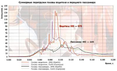Подсчет суммарного замедления головы водителя показал, что максимальное значение перегрузки достигло 94 g (g - это ускорение свободного падения). Но это еще не так страшно, поскольку